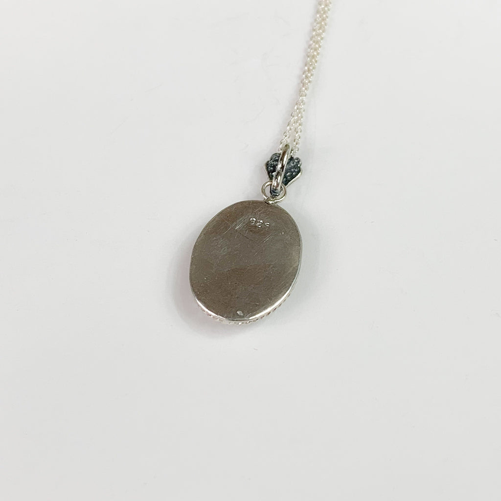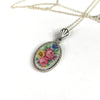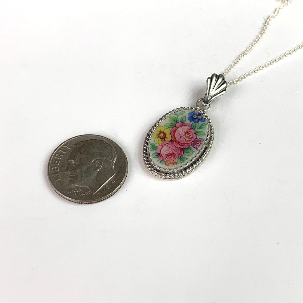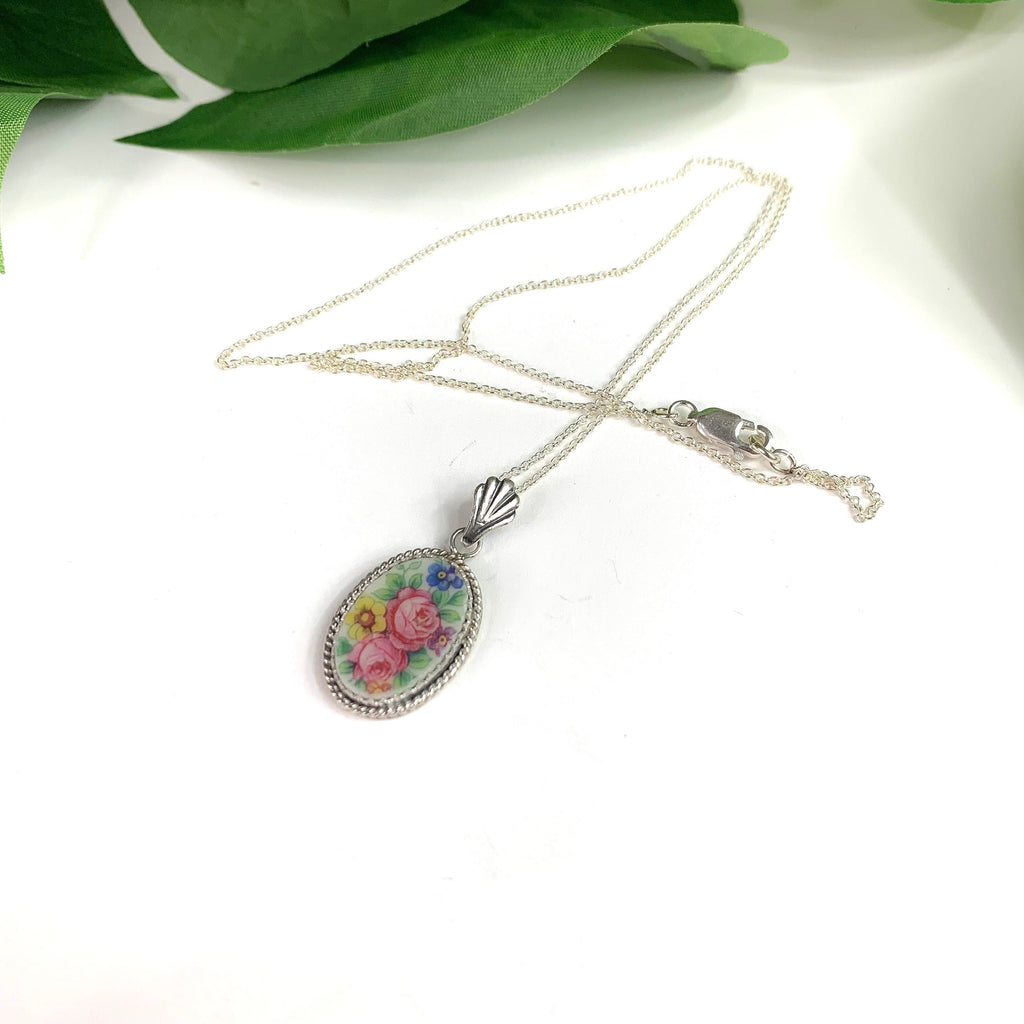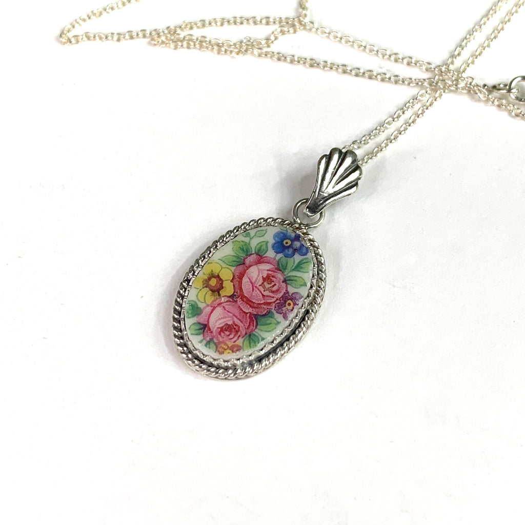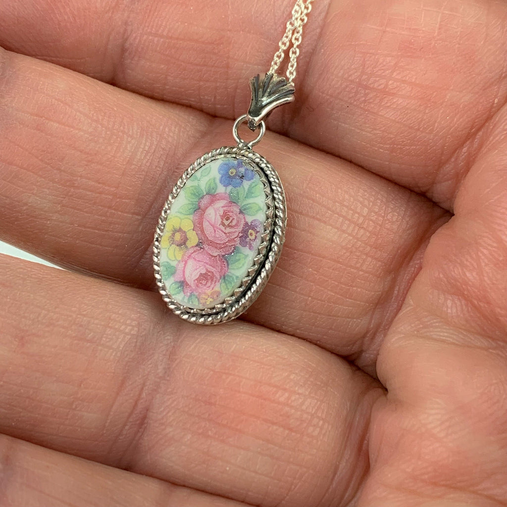 Made by our hands in our Ohio USA home based studio. This sweet little pendant makes anyone a great gift. The hand cut vintage cabachon is from a vintage czech plate. Mounted in a handmade 925 sterling silver setting. Includes a 18” sterling silver chain.