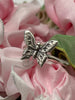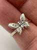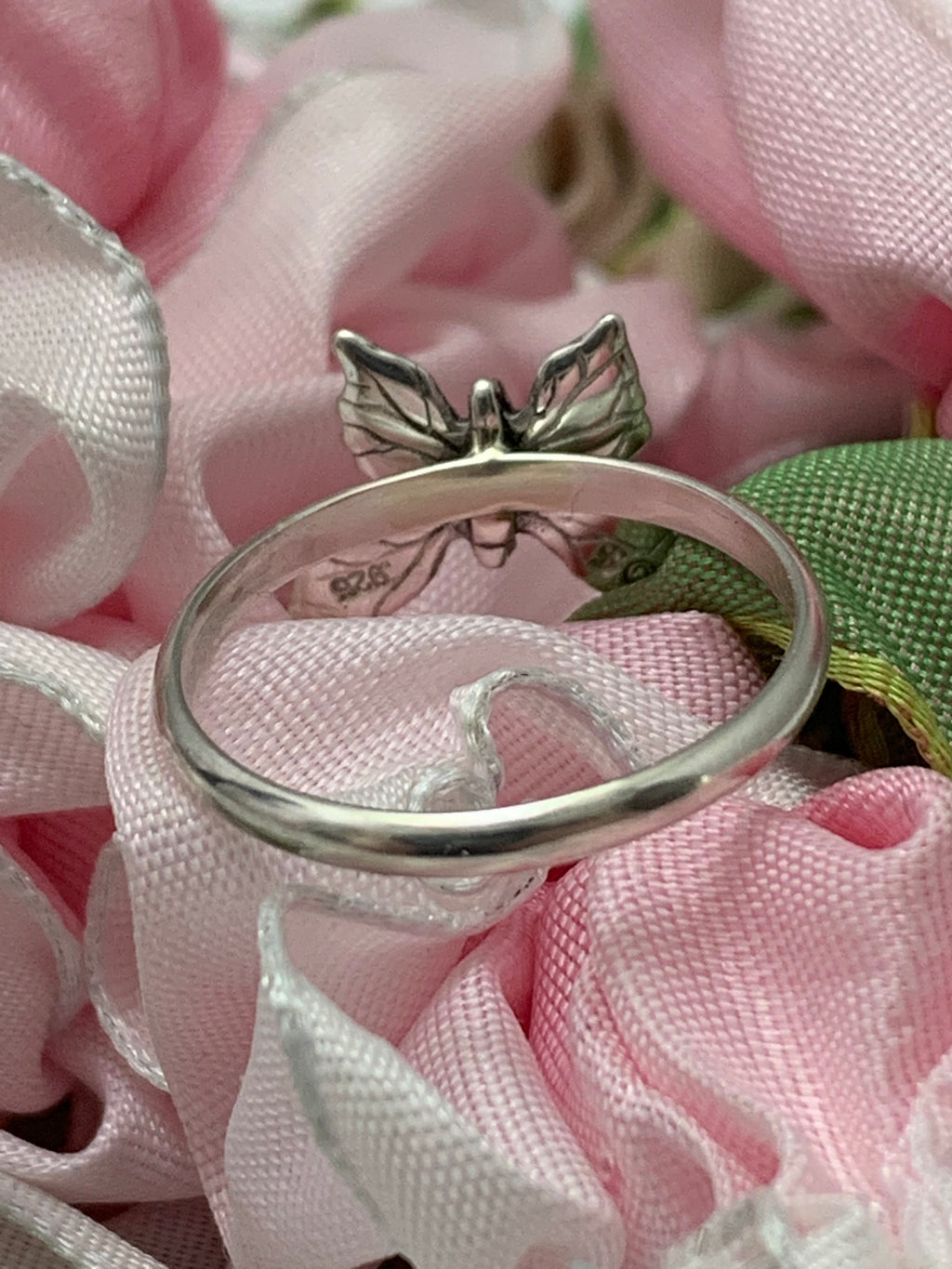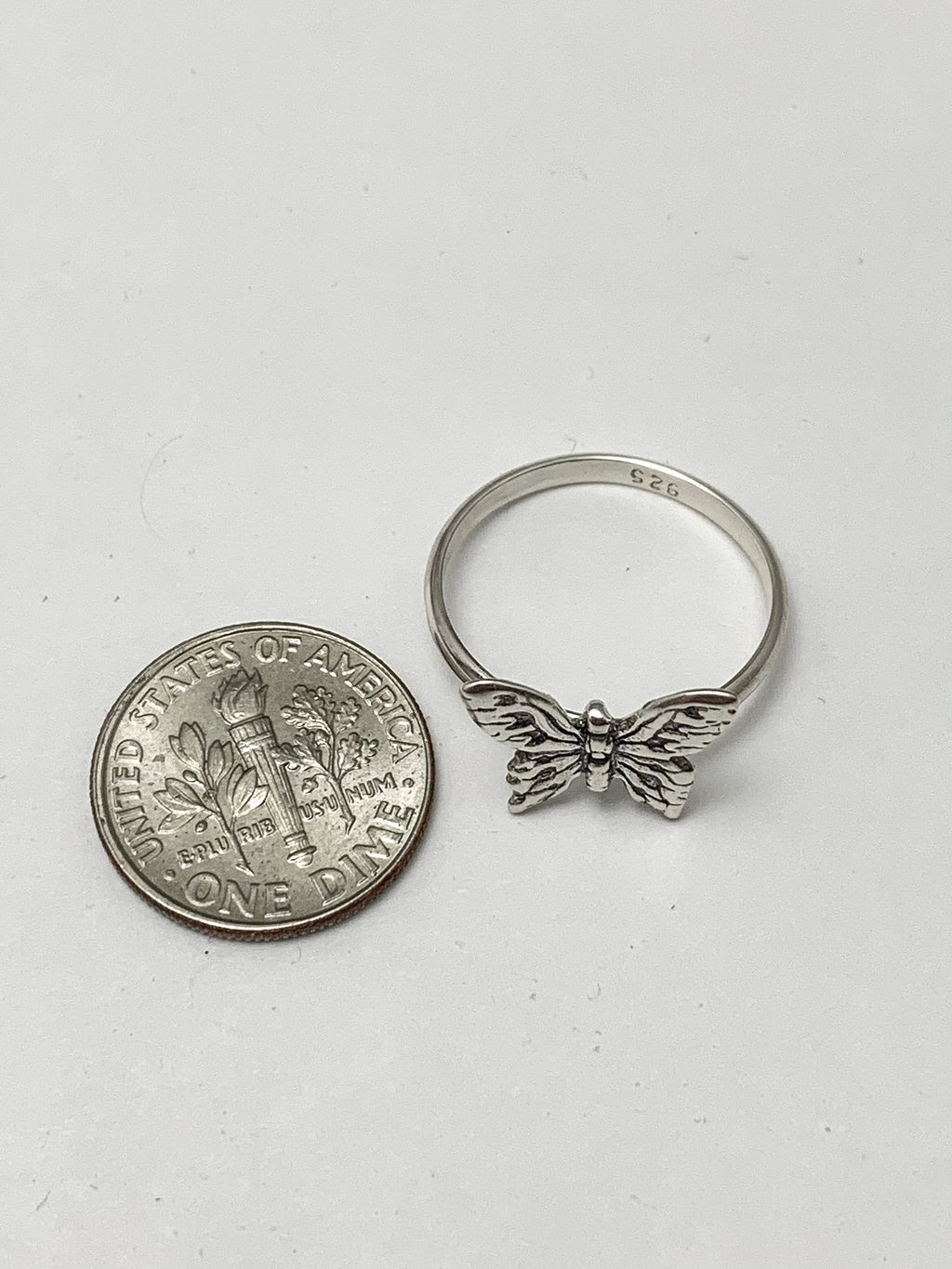 Made in our Ohio Studio. This ring is made from a sterling silver butterfly charm and a handmade sterling silver ring shank. The butter fly measures 11 x 14mm and the ring is available in various sizes form 4 to 12. We can also make this ring in quarter sizes. Just order the closest size and then message us your quarter size. We’ll make a ring just for you.